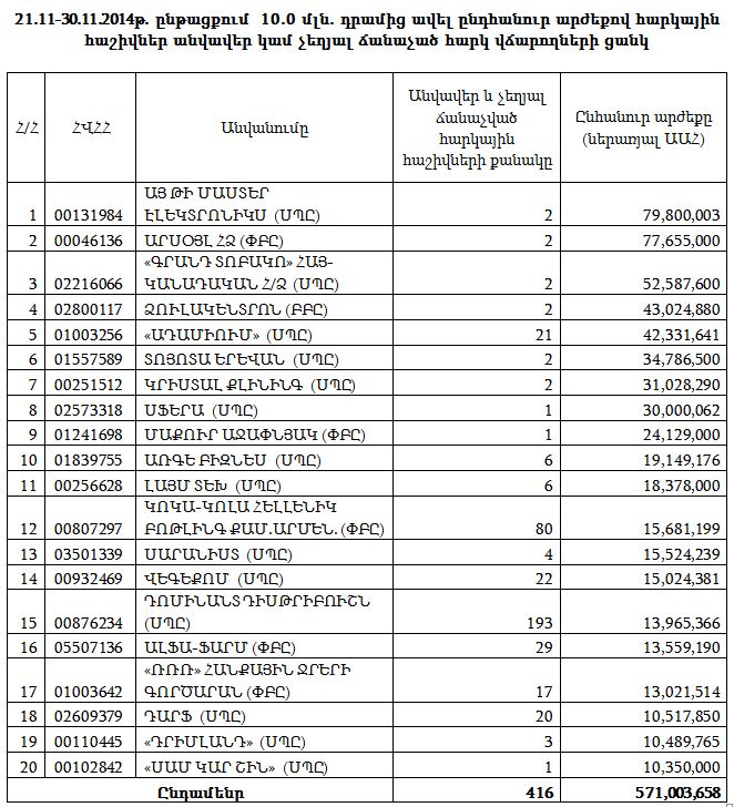 Մշտական հսկողության տակ առնված առավել խոշոր և թիրախային 100 ներմուծող և արտադրող հարկ վճարողների մոտ 2014 թվականի դեկտեմբերի 1-ից 10-ն ընկած ժամանակահատվածում նախորդ տարվա նույն ժամանակաշրջանի համեմատ մատակարարների կողմից դուրս գրված հարկային հաշիվների քանակն ավելացել է 25 հազար 260 հատով կամ 71.0%-ով, իսկ դրանցում արտացոլված շրջանառության գումարն աճել է 612.5մլն դրամով կամ 13.5%-ով: Նշված հարկ վճարողների մոտ 2014 թվականի դեկտեմբերի 1-ից 10-ն ընկած ժամանակահատվածում նախորդ ամսվա նույն ժամանակաշրջանի համեմատ մատակարարների կողմից դուրս գրված հարկային հաշիվների քանակը նվազել է 1063 հատով կամ 2.0%-ով, իսկ արտացոլված շրջանառության գումարն աճել է 1մլրդ 19.0մլն դրամով կամ 25.0%-ով:
