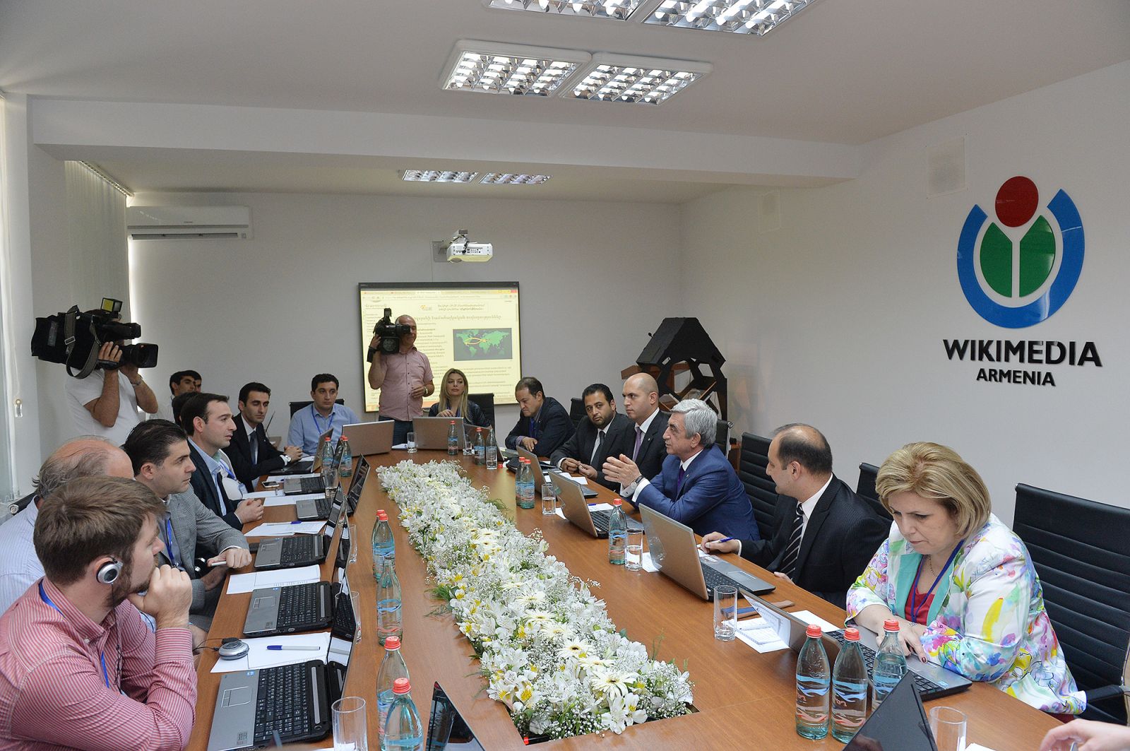 Գրասենյակի կոնֆերանս-սրահում Սերժ Սարգսյանը մասնակցել է Հայաստանում վիքի նախագծերի զարգացմանը վերաբերող հարցերի քննարկմանը, որին մասնակցել են նաև ՀՀ կրթության և գիտության նախարար Արմեն Աշոտյանը, ՀՀ մշակույթի նախարար Հասմիկ Պողոսյանը, «Ինտելեկտուալ Ռենեսանս» հիմնադրամի տնօրեն Հակոբ Հակոբյանը, հիմնադիր Արթուր Ջանիբեկյանը, «Վիքիմեդիա Հայաստան» ՀԿ նախագահ Սուսաննա Մկրտչյանը, «Վիքիմեդիա» հիմնադրամի խորհրդի նախագահ Յան Բարտ դե Վրիդը, հիմնադրամի գրանտների բաժնի և միջազգային հյուսիսային համագործակցության ղեկավար Ասաֆ Բարտովը, «Վիքիպեդիա» կրթական ծրագրի ղեկավար Աննա Կովալը, «Եվրոպեանա ԳԼԱՄ» վիքի ծրագրի համակարգող Ուիլիամ Վիատը, «Ինտելեկտուալ Վերածնունդ» հիմնադրամի տնօրեն Մարինա Սուլթանյանը և ծրագրերի համակարգող Արմեն Մարտիրոսյանը: